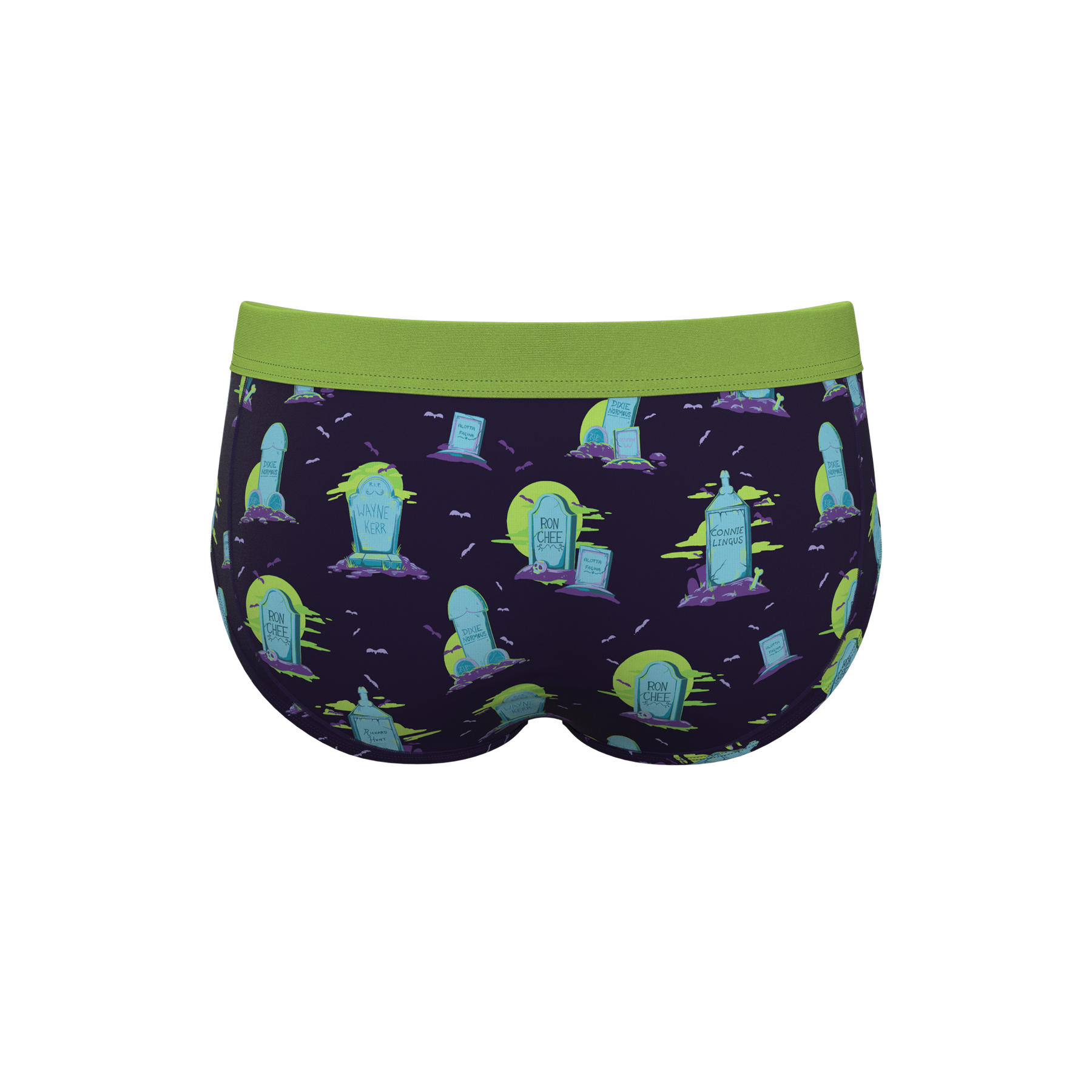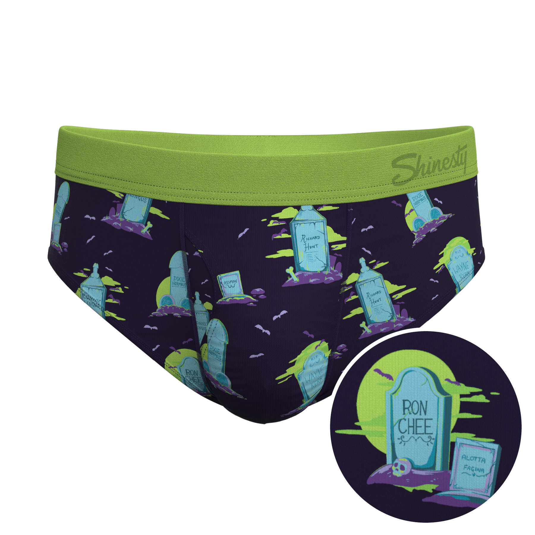 This product is a pair of men's Briefs (cut) from Shinesty, featuring a humorous tombstone/headstone print with punny, suggestive epitaphs.